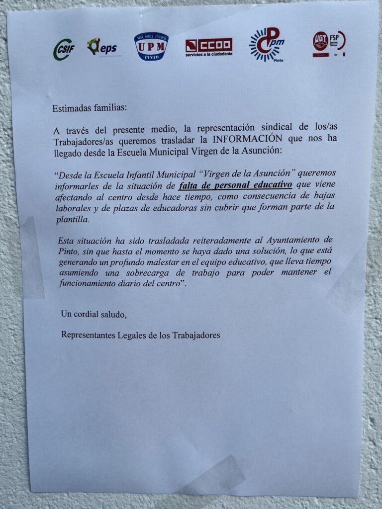 El equipo educativo asegura haber asumido responsabilidades adicionales para mantener el funcionamiento diario del centro, situación no sostenible en el tiempo. Tanto el personal como los sindicatos han trasladado este problema al Ayuntamiento de Pinto en varias ocasiones y reclaman una solución urgente.