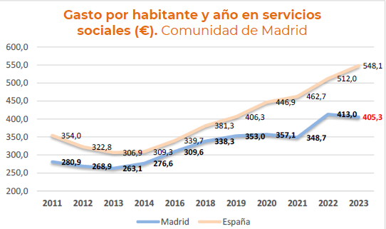 Uno de los datos más llamativos del informe es que Madrid tiene el menor gasto por habitante del país en servicios sociales, con 405,3 euros, frente a los 713,7 de Extremadura y los 1.203 euros del País Vasco, comunidad con régimen foral. Además, el porcentaje del PIB regional que la administración madrileña dedica a servicios sociales es del 0,95%, cifra que se encuentra muy por debajo de otras comunidades como Extremadura (3,03%).