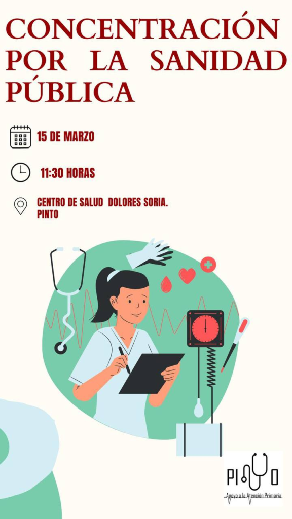 PINTO/13 MARZO 2026.- El próximo domingo, 15 de marzo, los vecinos de Pinto están convocados a una concentración en favor de la sanidad pública frente al Centro de Salud Dolores Soria. El acto, organizado bajo el lema «Apoyo a la Atención Primaria», comenzará a las 11:30 horas con el objetivo de reivindicar mejoras en el sistema sanitario local y mostrar el respaldo ciudadano a los profesionales del sector.